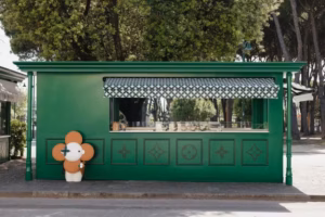 O quiosque é um espetáculo à parte. Pintado em um elegante tom de verde vintage que remete às cabines e à vibe costeira da Versilia, ele é decorado com as icônicas flores do Monograma, que saltam das embalagens para as cialde em formato floral que coroa cada gelato.